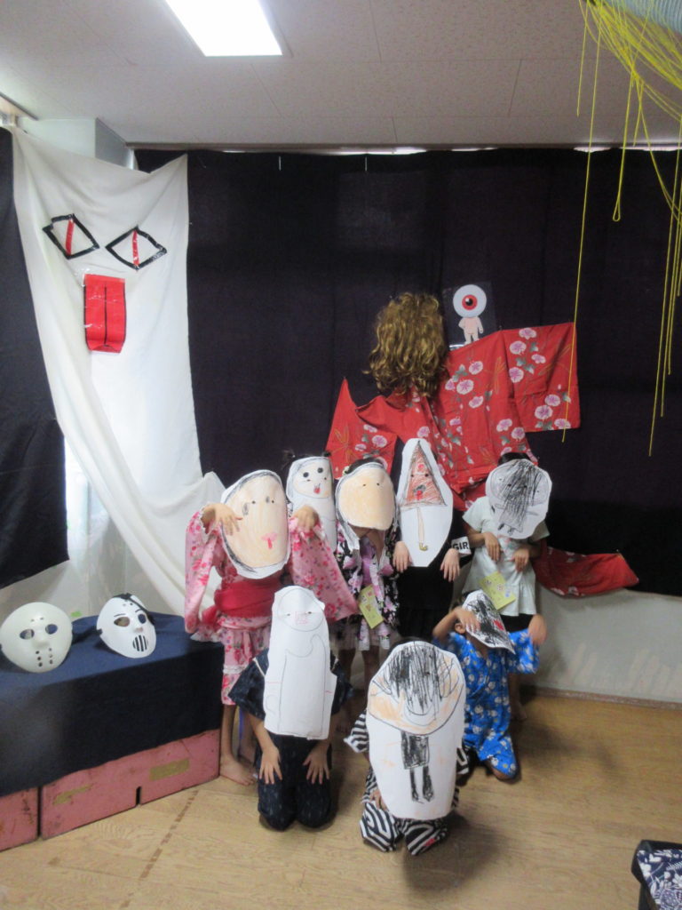 今年の夏まつりごっこは、お化けつり、魚つり、お面屋さん、まとあて、ポップコーン屋さん、そしてお化け屋敷と盛りだくさんです。